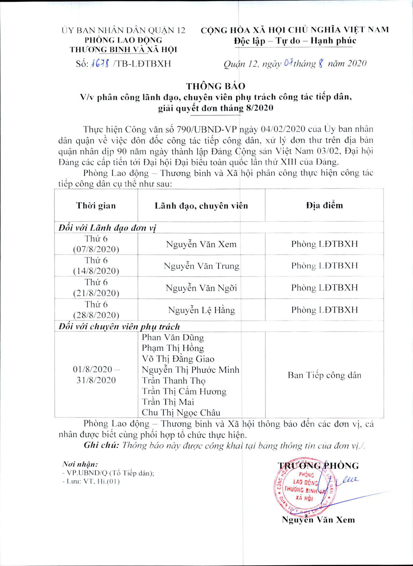 Thông báo: Về việc phân công lãnh đạo, chuyên viên phụ trách công tác tiếp dân, giải quyết đơn tháng 8/2020 của phòng Lao Động - Thương binh và Xã hội