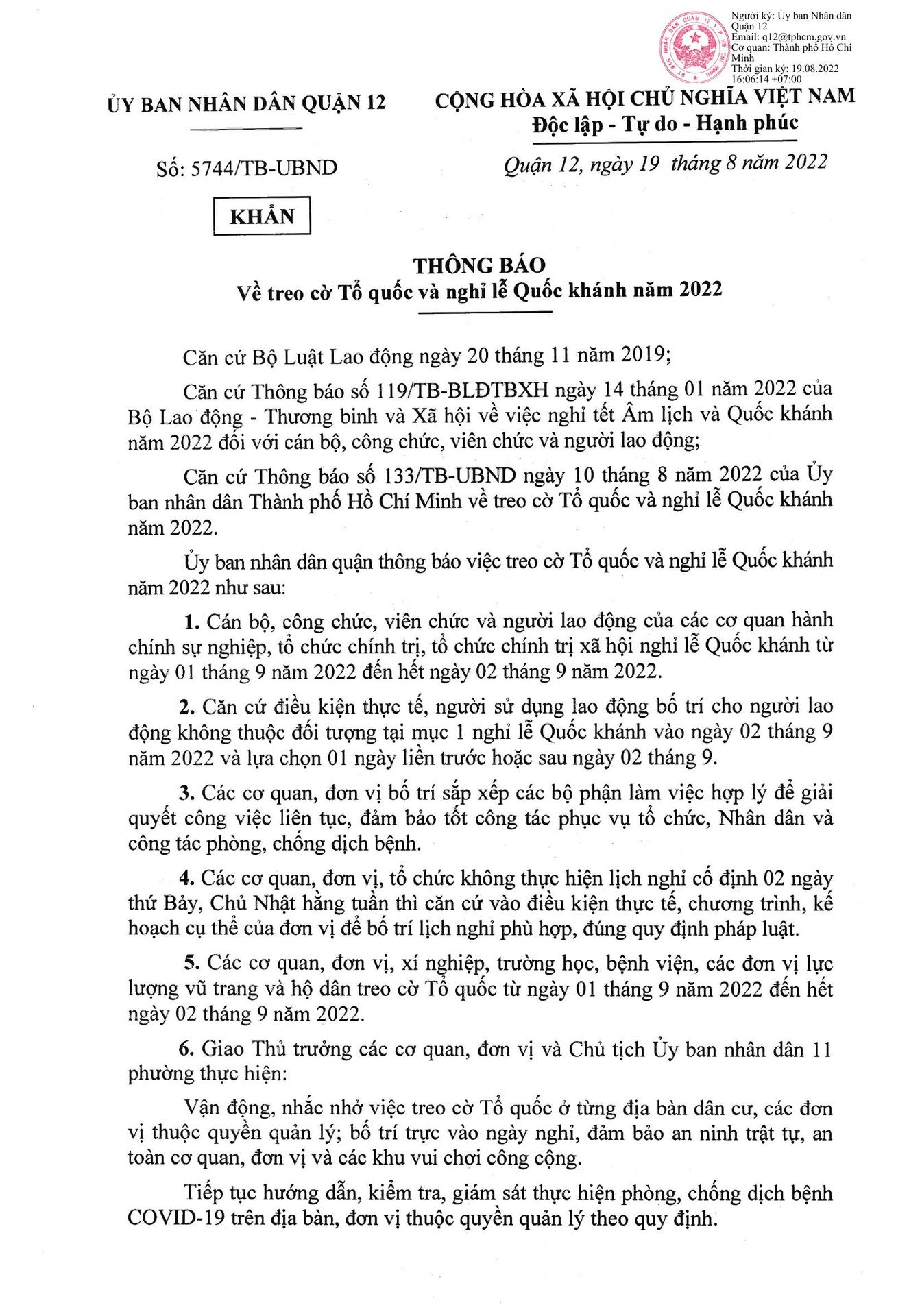 Thông báo: Về việc treo cờ Tổ quốc và nghỉ lễ Quốc khánh năm 2022