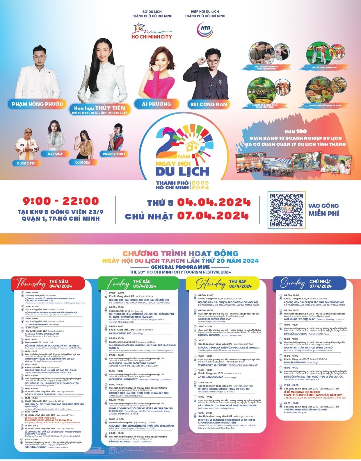 Ngày hội Du lịch Thành phố Hồ Chí Minh lần thứ 20 năm 2024 sẽ được tổ chức từ ngày 04/4/2024 đến ngày 07/4/2024 tại khu B, công viên 23 Tháng 9, Quận 1, Thành phố Hồ Chí Minh với chủ đề “20 năm hành trình sống động”. Ngày hội Du lịch Thành phố gồm chuỗi các hoạt động phong phú, đặc sắc nhằm thu hút người dân tham gia gồm:
