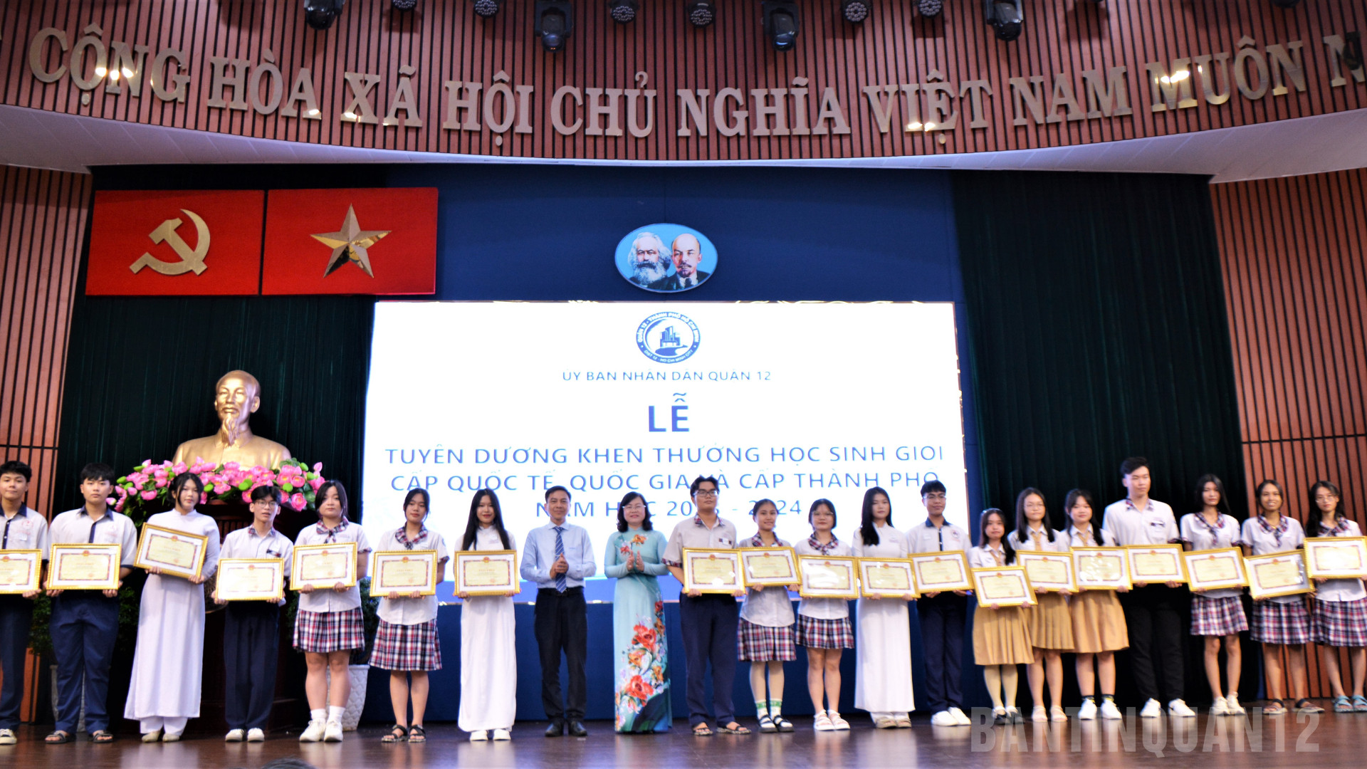 Sáng 20/5/2024, UBND quận tổ chức Lễ tuyên dương khen thưởng học sinh giỏi cấp Quốc tế, Quốc gia và cấp Thành phố năm học 2023 - 2024. Đến dự có đồng chí Nguyễn Bảo Quốc - Phó Giám đốc Sở Giáo dục - Đào tạo TPHCM; đồng chí Trần Hoàng Danh - Bí thư Quận ủy Quận 12; đồng chí Trần Văn Út - Phó Bí thư Thường trực Quận ủy; đồng chí Nguyễn Văn Đức - Phó Bí thư Quận ủy, Chủ tịch UBND quận; đồng chí Lê Tấn Tài - UVTV Quận ủy, Chủ tịch UB.MTTQ Việt Nam quận; đồng chí Huỳnh Tấn Việt - UVTV Quận ủy, Trưởng Ban Tuyên Giáo Quận ủy; đồng chí Nguyễn Văn Năm - UVTV Quận ủy, Trưởng Ban Dân vận Quận ủy; đồng chí Võ Thị Chính - QUV, Phó Chủ tịch UBND quận.