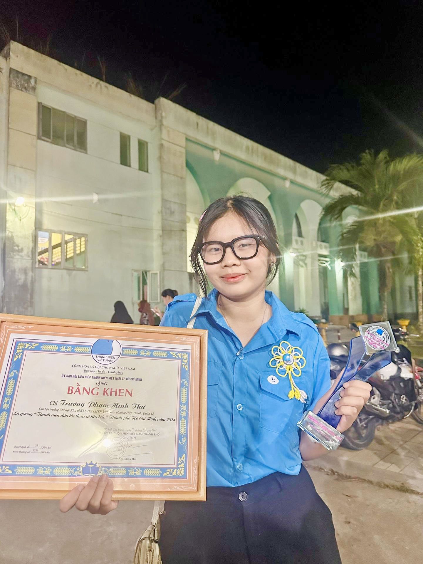 Với những cố gắng của mình, vừa qua, em được Ủy ban Hội Liên hiệp Thanh niên Thành phố Hồ Chí Minh tặng Bằng khen “Gương thanh niên dân tộc thiểu số tiêu biểu” Thành phố Hồ Chí Minh năm 2024; UBND Quận 12 khen thưởng “Gương thanh niên dân tộc thiểu số tiêu biểu” năm 2024. Tấm gương của em Trương Phạm Minh Thư góp phần phát triển văn hóa, con người Việt Nam đậm đà bản sắc dân tộc trong xu thế toàn cầu hóa và hội nhập kinh tế quốc tế; đẩy lùi được các tư tưởng ngoại lai, trào lưu xấu độc, xây dựng, giữ gìn phát triển nền văn hóa các dân tộc trong đội ngũ thanh niên trẻ./.