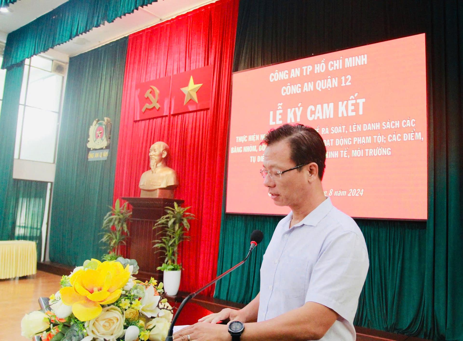 Ngày 23/8/2024, Công an Quận 12 tổ chức Lễ ký cam kết thực hiện nghiêm các chỉ đạo về rà soát, lên danh sách các băng nhóm, đối tượng nghi vấn về hoạt động phạm tội; các điểm, tụ điểm về hình sự, ma túy, kinh tế, môi trường trên địa bàn.