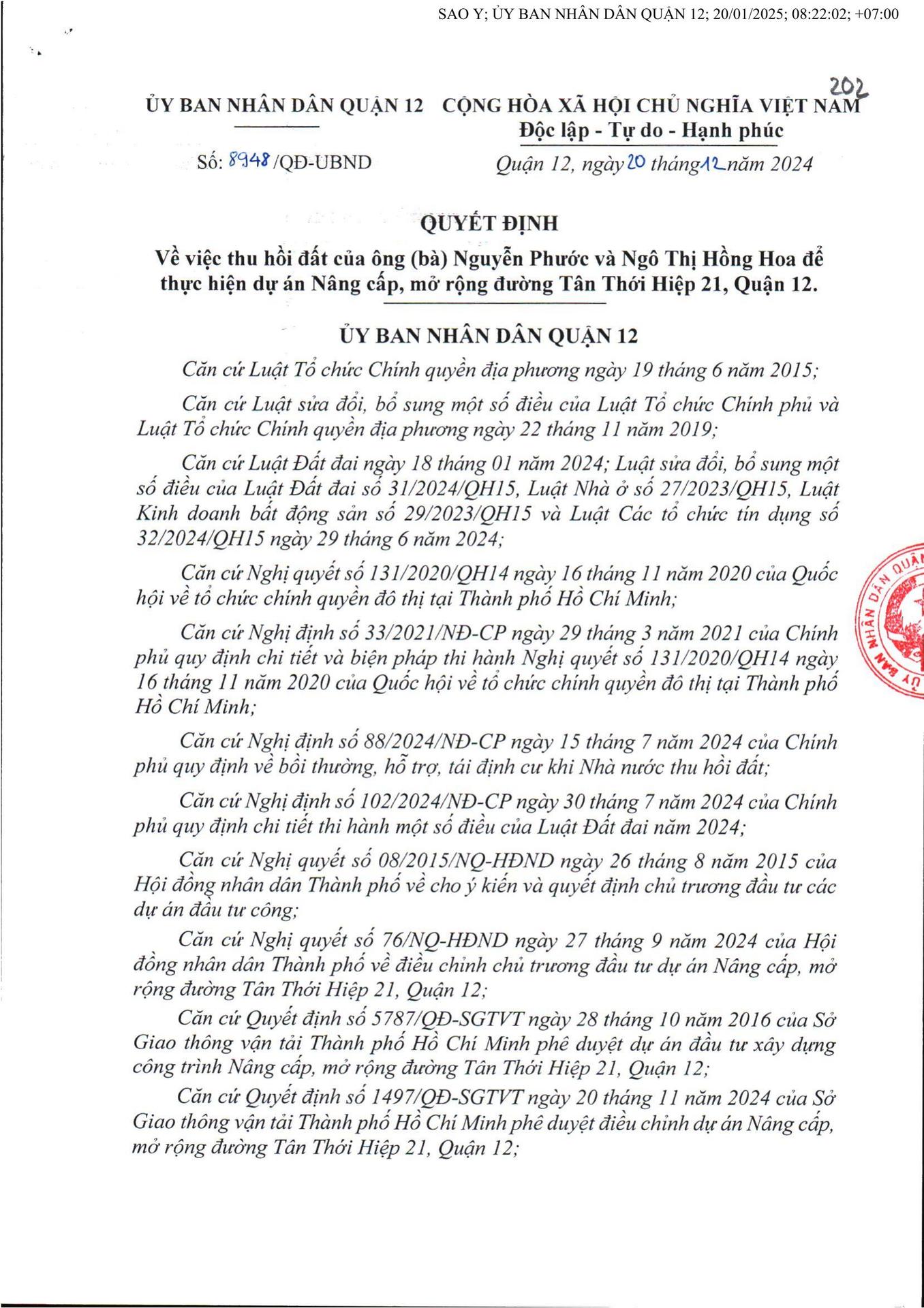 Quyết định thu hồi đất để thực hiện dự án Nâng cấp, mở rộng đường Tân Thới Hiệp 21, Quận 12 của ông (bà) Nguyễn Hữu Phước, Lê Thị Cẩm Thu (20/01/2025)