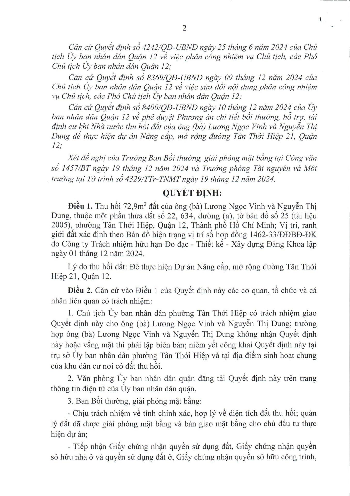 Quyết định thu hồi đất để thực hiện dự án Nâng cấp, mở rộng đường Tân Thới Hiệp 21, Quận 12 của ông (bà) Lương Ngọc Vinh, Nguyễn Thị Dung