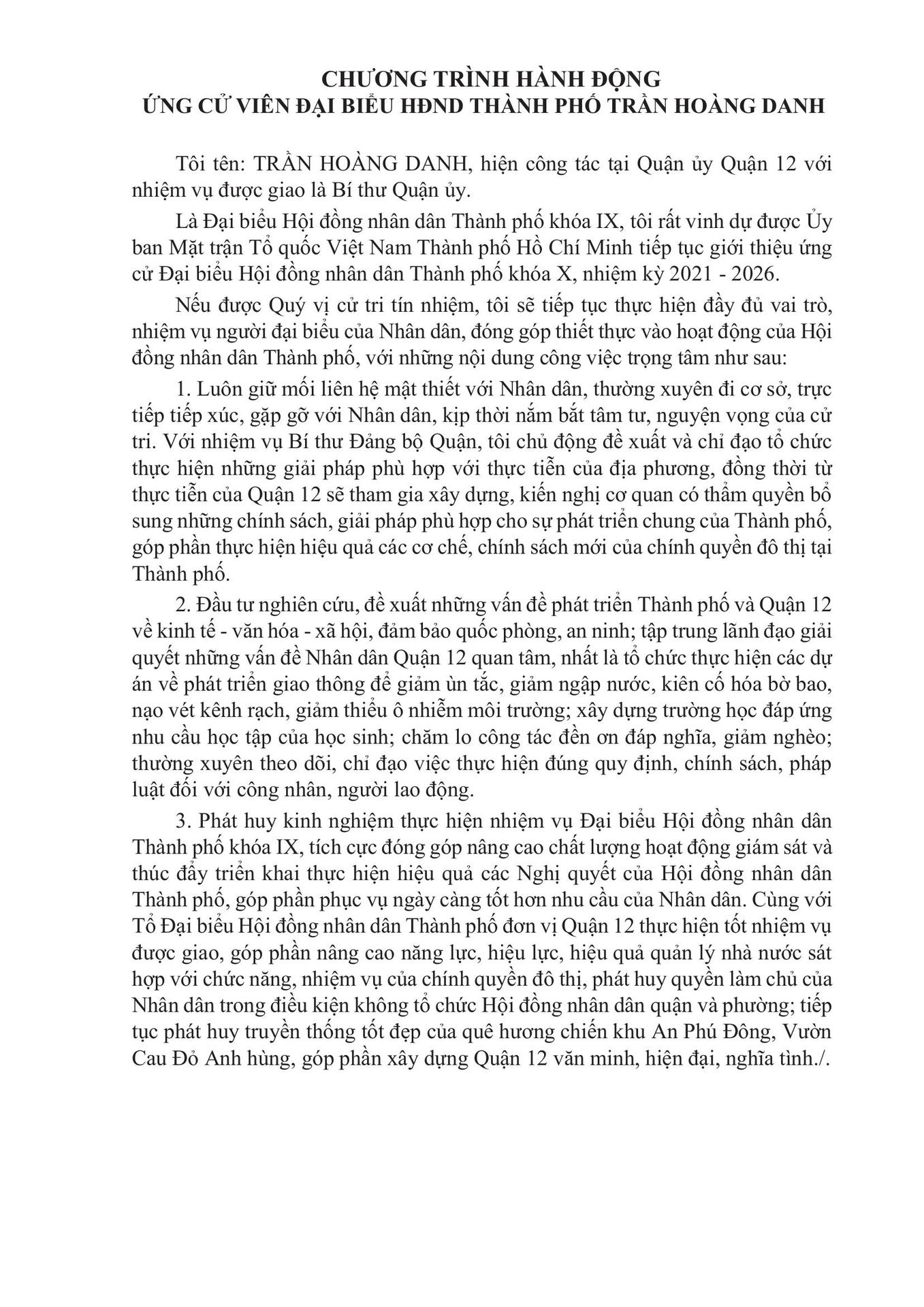 Tóm tắt tiểu sử và chương trình hành động ứng cử viên Đại biểu HĐND Thành phố Hồ Chí Minh (nhiệm kỳ 2021-2026) - Trần Hoàng Danh