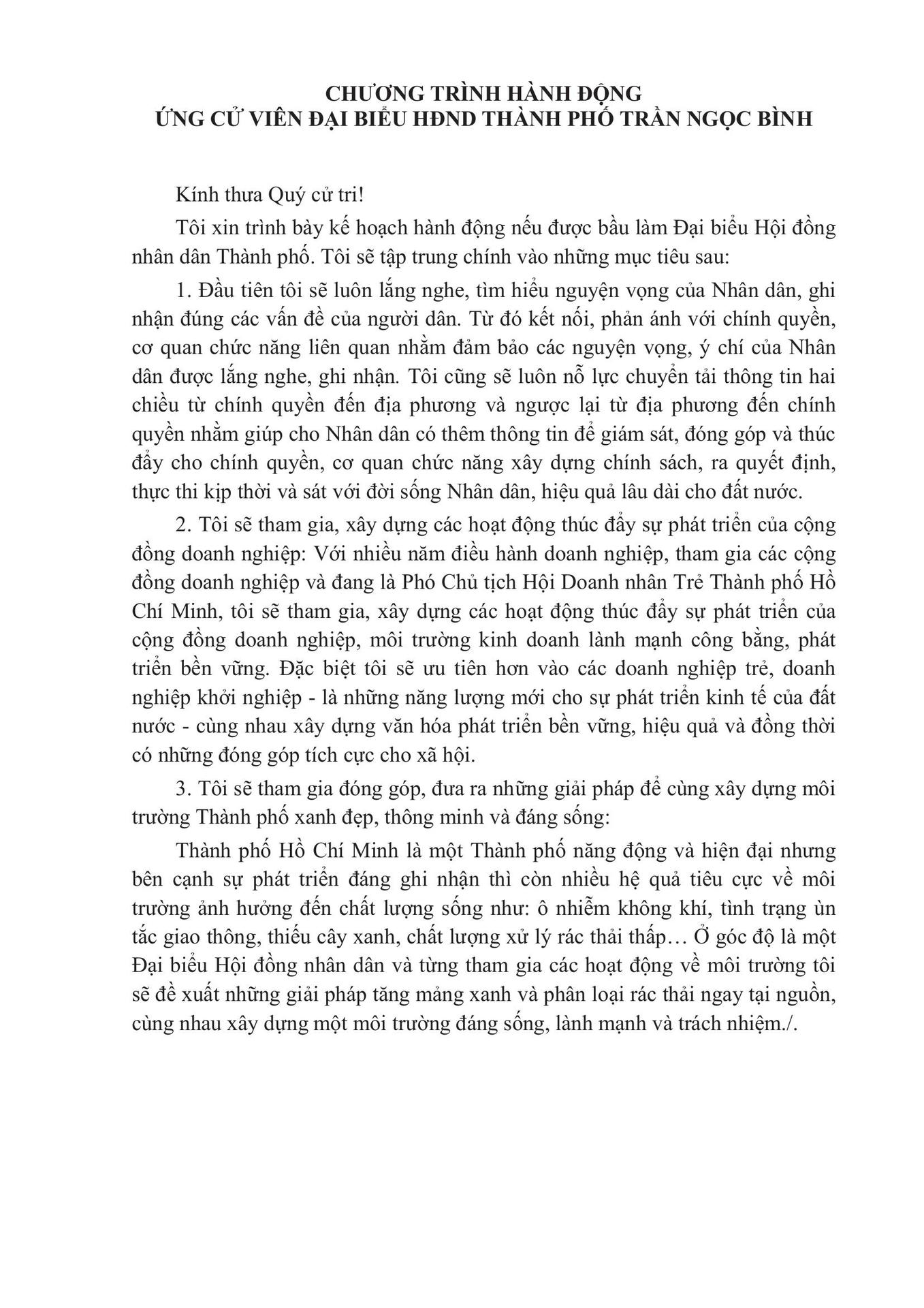Tóm tắt tiểu sử và chương trình hành động ứng cử viên Đại biểu HĐND Thành phố Hồ Chí Minh (nhiệm kỳ 2021-2026) - Trần Ngọc Bình