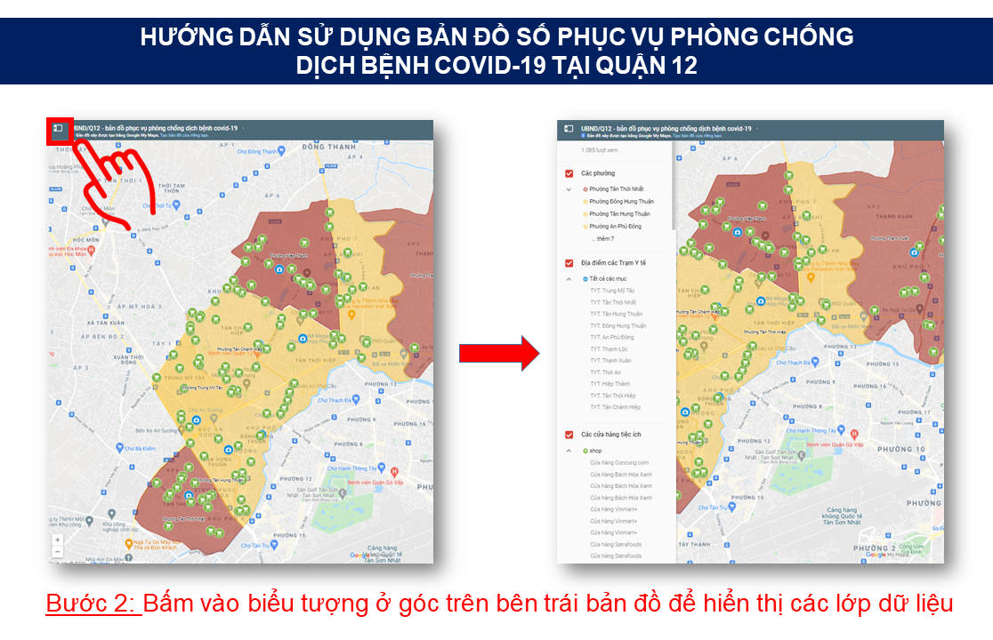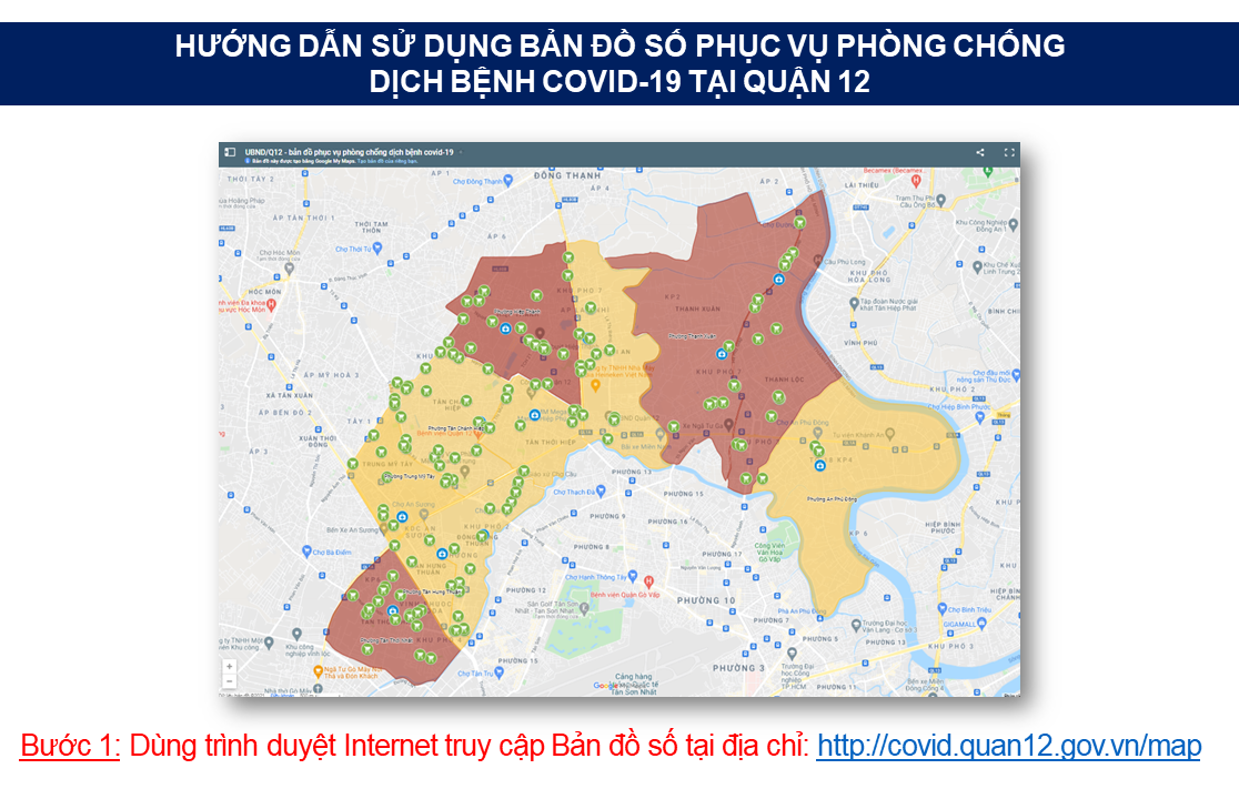 Nhằm hỗ trợ Nhân dân có nhu cầu mua sắm nhu yếu phẩm và thuận tiện liên hệ các trạm y tế phường trong thời điểm thực hiện cách ly xã hội phòng chống dịch Covid-19 theo Chỉ thị số 16/CT-TTg ngày 31/3/2020 của Thủ tướng Chính phủ, UBND Quận 12 giới thiệu Bản đồ số phục vụ phòng chống dịch bệnh Covid-19 tại Quận 12, địa chỉ truy cập: http://covid.quan12.gov.vn/map