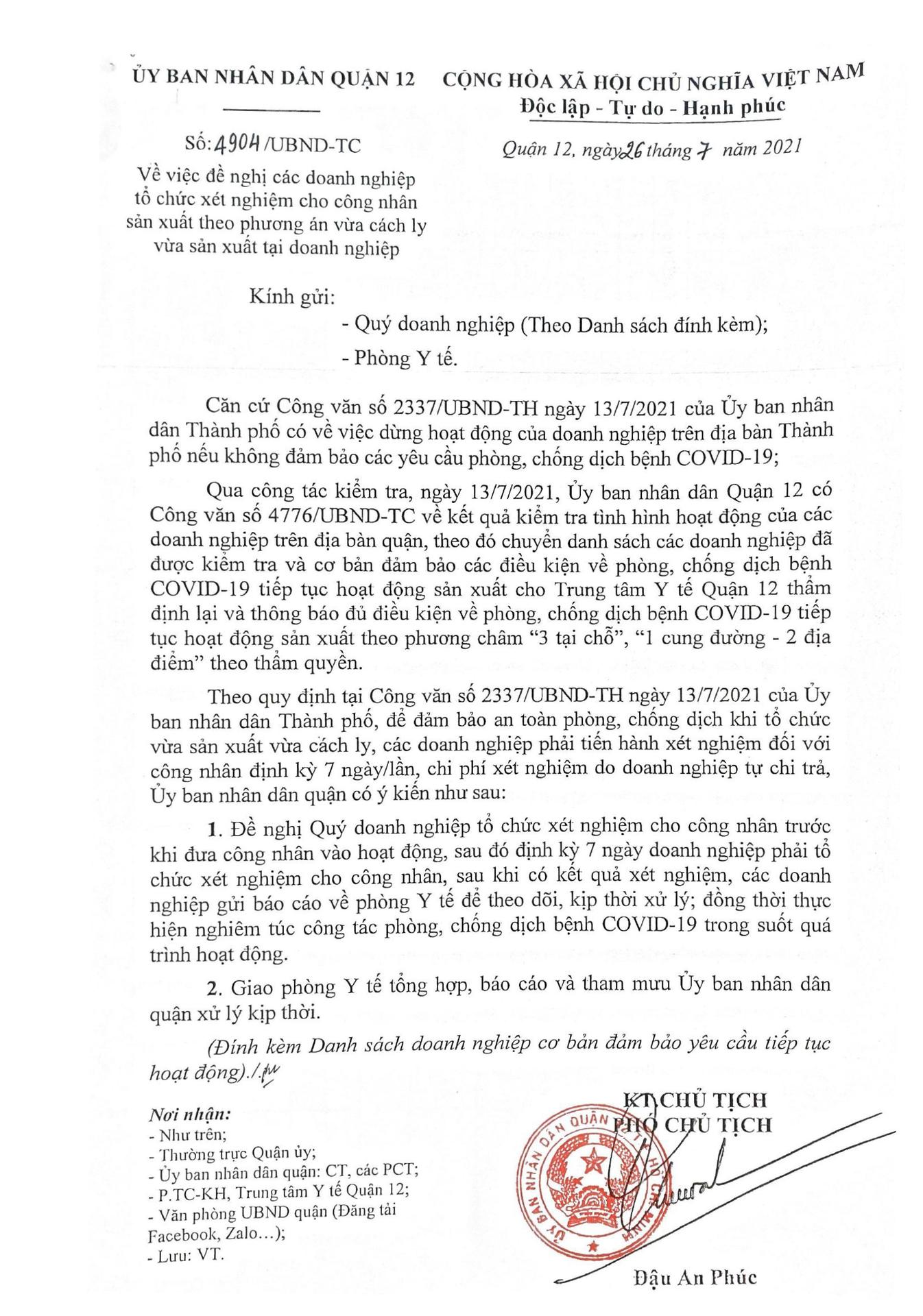 Quận 12 tăng cường một số biện pháp thực hiện Chỉ thị số 16/CT-TTg của Thủ tướng Chính phủ về phòng, chống dịch Covid-19 trên địa bàn Thành phố theo Chỉ thị số 12-CT/TU ngày 22 tháng 7 năm 2021 của Thành ủy (28/07/2021)